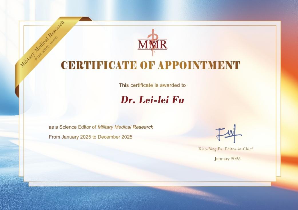 近日,西南交通大学生命科学与工程学院符雷蕾副教授受Military Medical Research总编辑付小兵院士邀请,被任命为Military Medical Research(MMR)科学编辑。