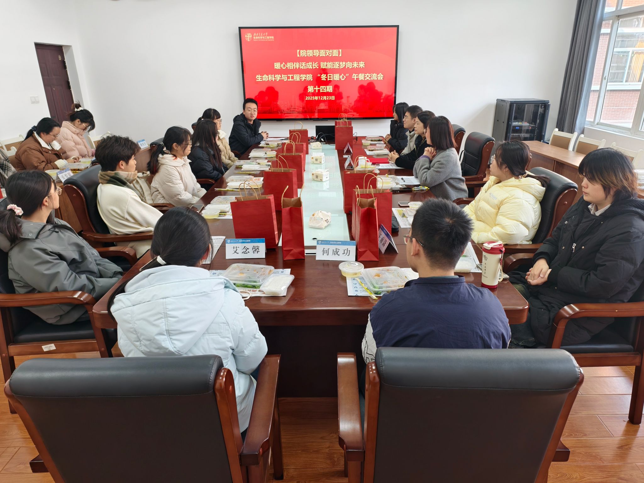 12月23日中午,生命学院以“暖心相伴话成长,赋能逐梦向未来”为主题,举办“冬日暖心”师生午餐交流会。学院党委书记黄春蓉、党委副书记高鹏及学工组部分辅导员与学生代表参加午餐交流会。